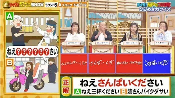正解は「ねえさんばいください(ねえ三杯ください/姉さんバイクダサい)」。松井さん、直江さん、秋川さんの3人が正解!