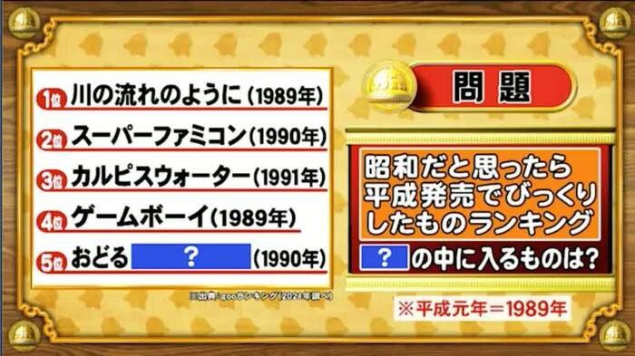 最後は、日常ランキングの問題。「昭和だと思ったら平成発表でびっくりしたものランキング」、第5位の「?」の中に入る言葉は何でしょうか。