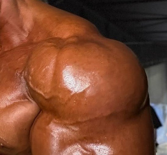 肩の付け根から上腕骨にかけての三角筋は、丸みと厚みを兼ね備え、まるでかぼちゃのように大きく膨らんでいます。
