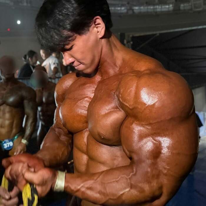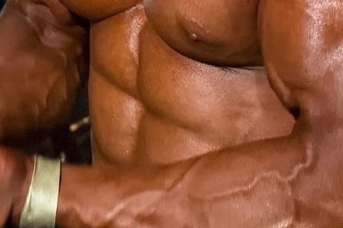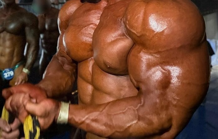 さらに圧巻なのが腕まわり!上腕二頭筋は力を込めた瞬間に峰のようにせり上がり、三頭筋は裏側から押し出すように膨れ上がっていて、表面には無数の血管が浮き出ています。まるで体内のエネルギーがそのまま可視化されたかのようで、思わず二度見してしまうようなインパクトです。