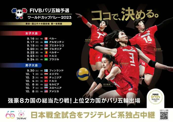 本大会は、9月16日(土)~24日(日)に女子、9月30日(土)~10月8日(日)に男子大会が行われ、『FIVB パリ五輪予選/ワールドカップバレー2023』として、日本戦全試合をフジテレビ系列で独占中継します。