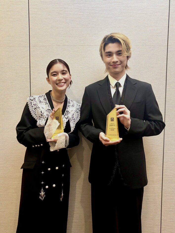 芳根さんは、華やかな白レースが印象的なブラックのワンピース姿。本田さんはシンプルなブラックスーツに金髪姿で登場しました。2人とも金色に輝く盾を手に、うれしそうなスマイルを見せています。