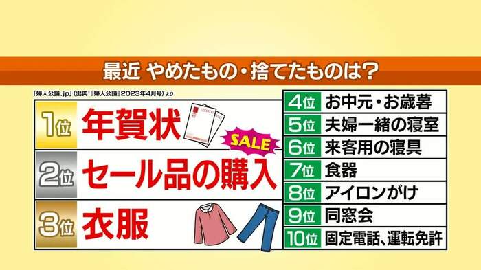 「婦人公論」のウェブサイトで発表された「最近、やめたもの・捨てたものは?」という、アンケート調査の結果も紹介されました。