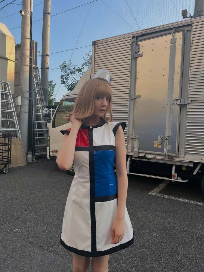 金髪外ハネボブ×膝上ミニ丈ワンピ姿で抜群のスタイルを披露