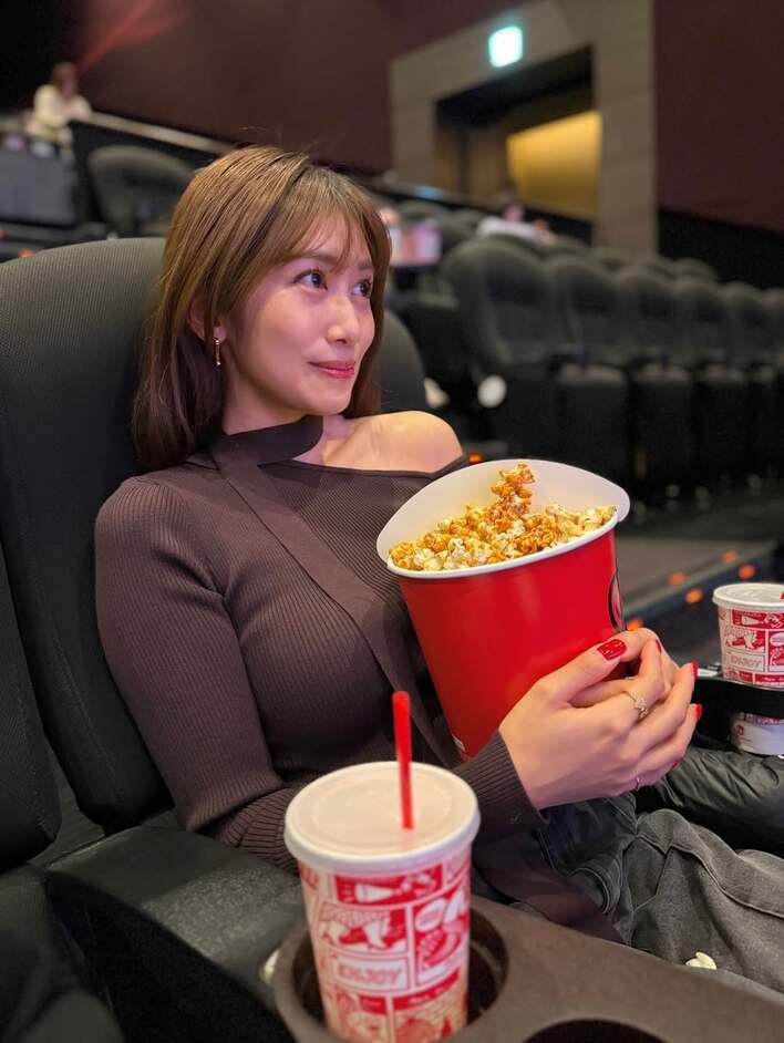 公開された写真には、映画館の座席で大きなポップコーンを抱えた中川さんの姿が。中川さんは、片方の肩を大胆にのぞかせたオフショルダーのチョーカーニットを身にまとい、わくわくした表情で前を見つめています。