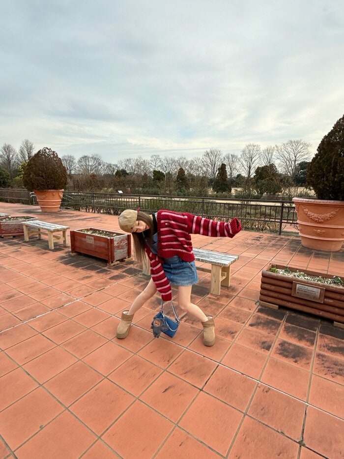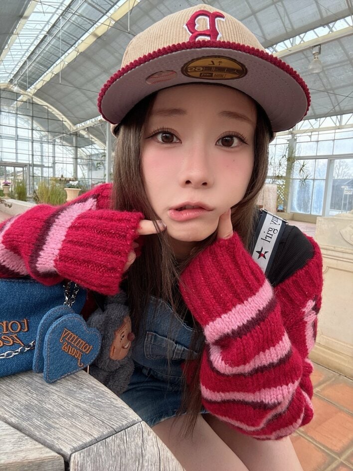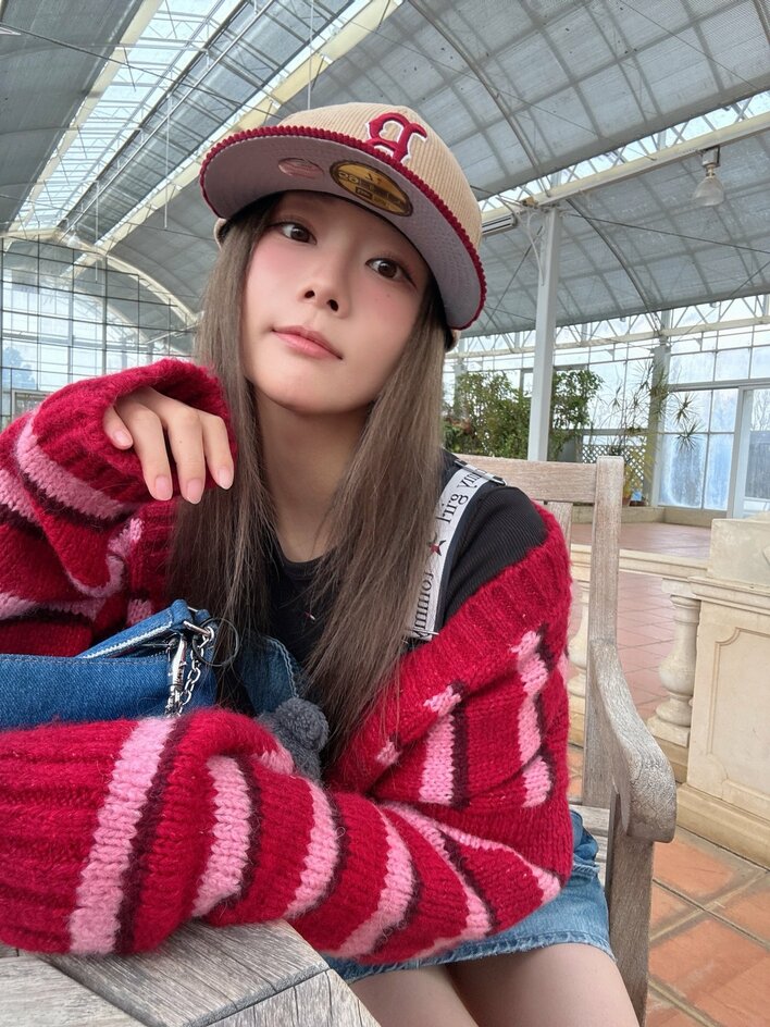 この日のコーデを見ると、赤とピンクのボーダー柄のニットカーディガンを羽織り、膝上ミニ丈のデニムスカートを合わせています。ベージュのキャップをかぶっていて、ストリート感あふれるコーデに。