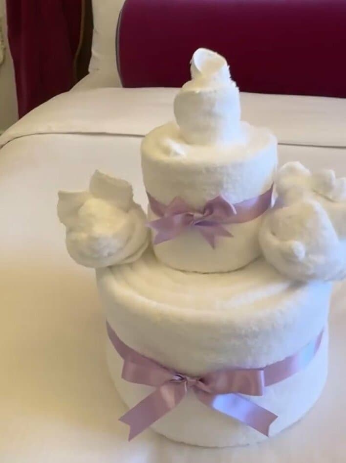 ベッドの上には、誕生日ケーキの形をしたタオルアートが置かれていて、キャラクターをモチーフにしたデザインがとってもかわいらしいです。