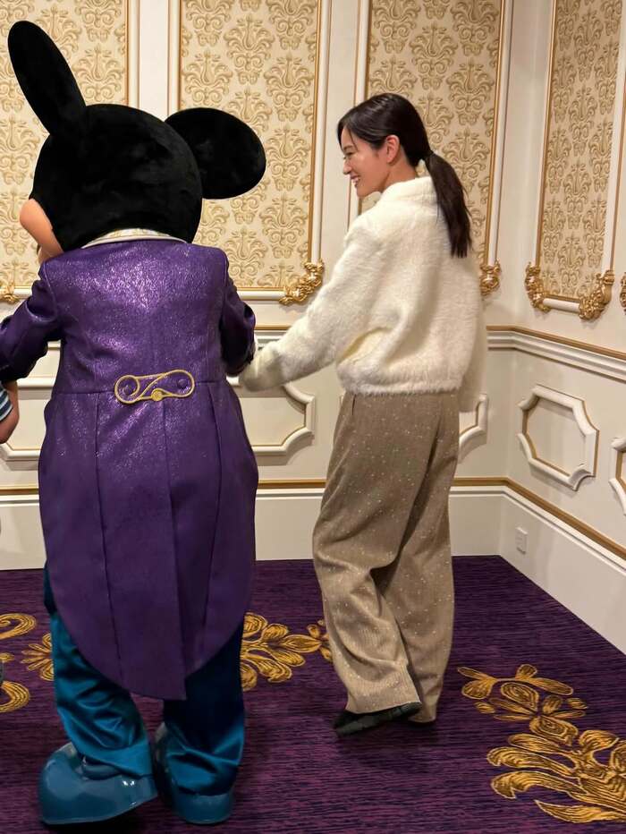 さらに、パープルの豪華な衣装を着たミッキーに手を引かれ、笑顔で歩く姿や・・・