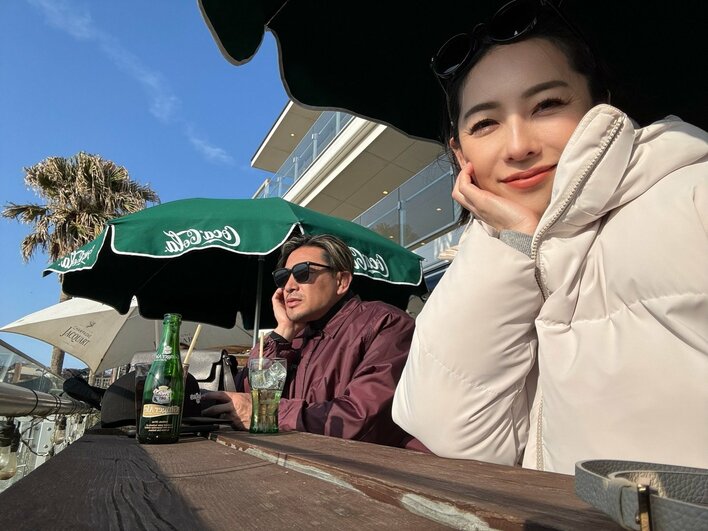 白のダウンコートを羽織った矢沢さんはカメラに向かってニッコリほほ笑み、一方の魔裟斗さんはサングラスをかけ、頰づえをつきながら海を眺めているようでした。