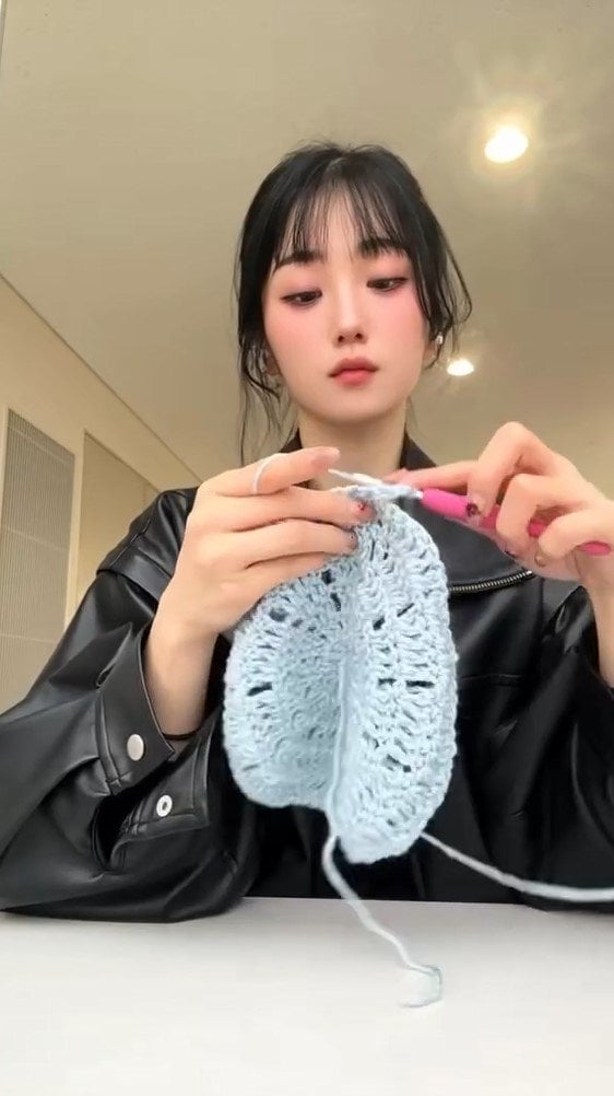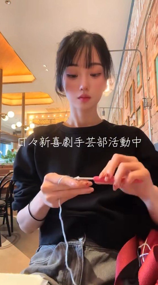 今回の投稿では「花束作りにハマってるこてまりちゃんです。」とつづり、編み物作品を制作する様子を公開!カジュアルコーデの小寺さんはカフェに訪れ、水色の糸を使って早速編み始めます。