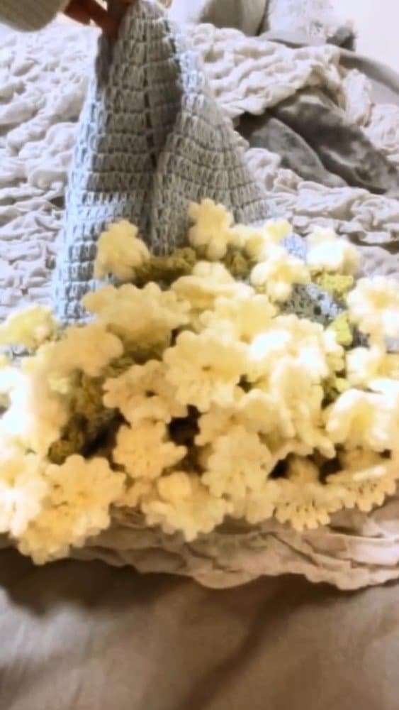 完成した様子を見ると、大きな円形のブランケットの端にお花が付いています。まばらな箇所はなく、丁寧に編まれていることがうかがえました。