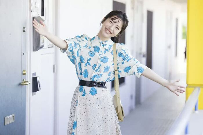 「ACUO 今日は誰に会いに行く?」篇に出演する浜辺さんは、青空のように爽やかなブルーの花柄ワンピースに、スリット入りのドット柄スカートを重ね、黒いウエストベストを締めた涼しげな衣装で現場入り。