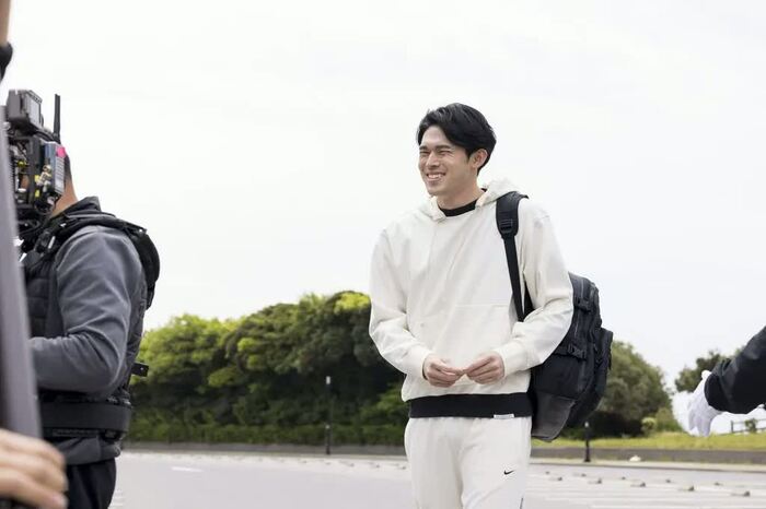 シンプルな、白のスウェット上下を着こなした自然体の佐々木選手は、リラックスした表情でスタッフと談笑しながら現場に入り、本番が近づくと少し緊張気味な様子で監督からの演技説明を受けました。
