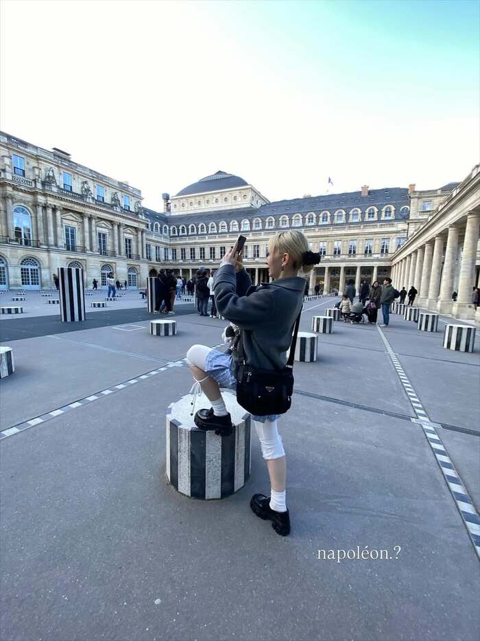 最後には、パレ・ロワイヤルと思われる、白と黒の縦縞の柱が並ぶ中庭広場でのショットも披露。
