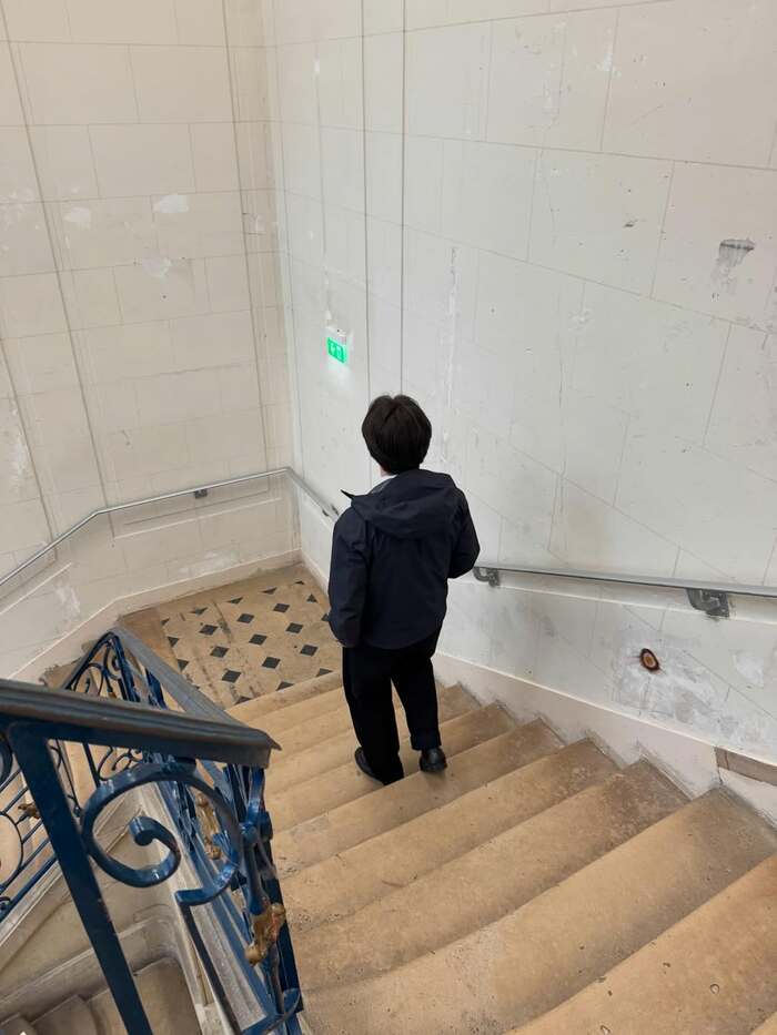 白いタイルの壁と青い鉄製の装飾手すりが印象的な空間では、階段を降りていく兄の後ろ姿を収めた写真も公開。