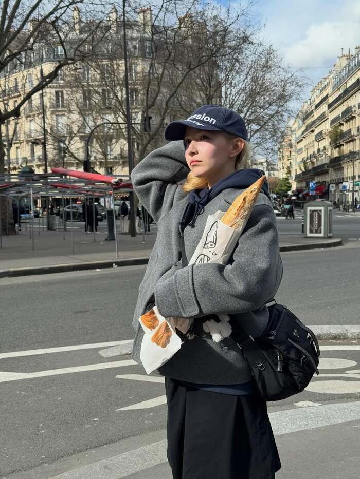 頭の後ろに手を添えながら、左腕には本場の長いバゲットを抱える姿が印象的です。遠くを見つめるクールな表情が、石造りの建物や裸木の並木が広がる街並みと見事にマッチし、“パリらしさ”あふれる一枚となっています。