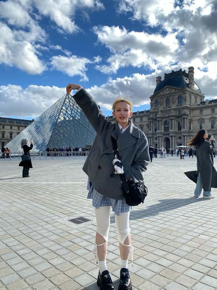 ルーヴル美術館前の広場では、ガラスのピラミッドを遠近法で指先につまんでいるようなポーズを披露。