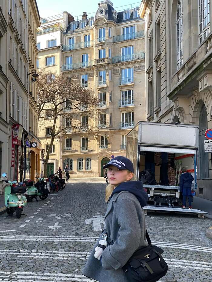 パリの石畳の路地ではふと振り返るショットを披露。