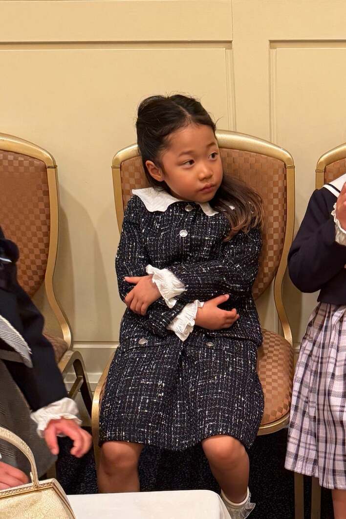 そこには、椅子に座りリラックスした長女の姿が。長女はツイードのセットアップに身を包み、かわいくおめかししています。