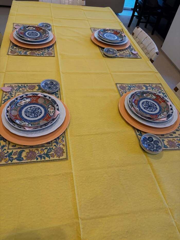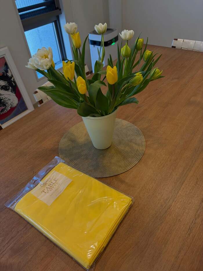 木製テーブルの中央には、黄色や白の花が飾られており、そばには黄色のテーブルクロスが置かれています。