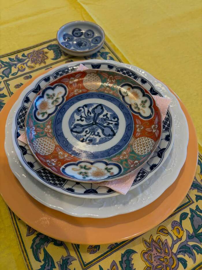 そして、絵柄が美しい赤絵の古伊万里の食器を中心に4枚のお皿を重ねると…