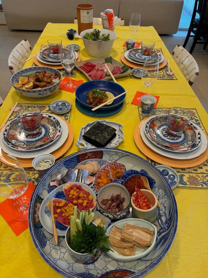 さらに、料理だけではなく「赤絵の古伊万里中心に。箸置きは桜です」と、テーブルをセッティングしていく様子も公開。