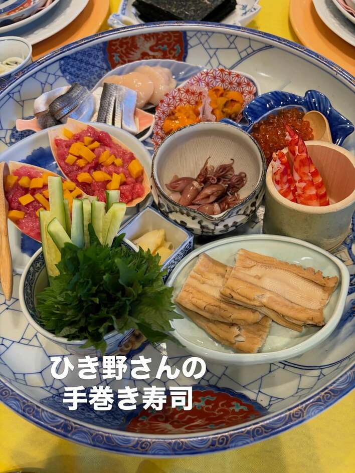 上品さを感じるお皿に丁寧に盛り付けた、手巻き寿司用のいくら、ウニ、ホタルイカ、えびなど多種類の寿司ネタや…