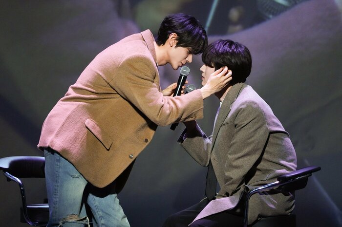 ファンの推しシーンを堪能したあとは、3人が名シーンを再現。ソンヒョンさんは、映画館でダオンに「手を握っていいか」と聞くシーンを演じることに。このシーンには、ダオン役が必須ということで、ホヨンさんが代役を務めました。