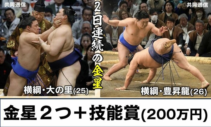 横綱・大の里(25)、横綱・豊昇龍(26)、相手に2日連続金星を挙げました。