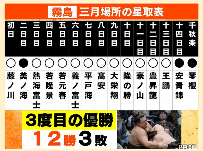3月22日に千秋楽を迎えた大相撲春場所。横綱・豊昇龍などを破った関脇・霧島(29)が、14場所ぶり3度目の優勝を飾りました。