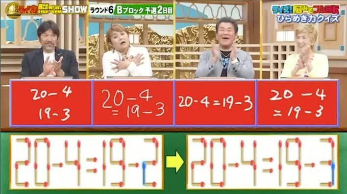 正解は、右の式の「2」から1本を動かして「3」にします。そうすれば「20-4=19-3」となります。見事全員正解!
