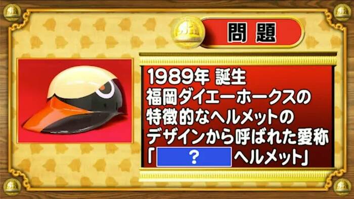 次は、ユニフォーム問題。今から34年前の1989年、この年に誕生した福岡ダイエーホークスの特徴的なヘルメットのデザインから呼ばれた愛称は「[?]ヘルメット」。「?」に入る言葉を答えてください。