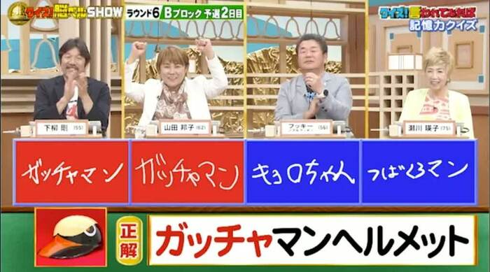 今回の解答者は、元プロ野球選手・下柳剛さん(55)、お笑いタレント・山田邦子さん(62)、ものまねタレント・フッキーさん(56)、演歌歌手・瀬川瑛子さん(75)の4名です。