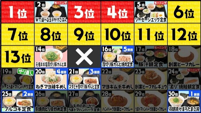 今回は、牛丼チェーン「松屋」の人気メニュー30品(番組がセレクト)の中から、「最新販売個数ランキング」の順位を、下位から上位へとカウントダウンするように予想しました。