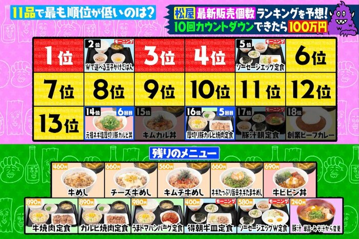 今回は、2位「Wで選べる玉子かけごはん」と、5位「ソーセージエッグ定食」があらかじめ公開されていて、1位、3位、4位を当ててしまうと賞金がゼロになるルール。