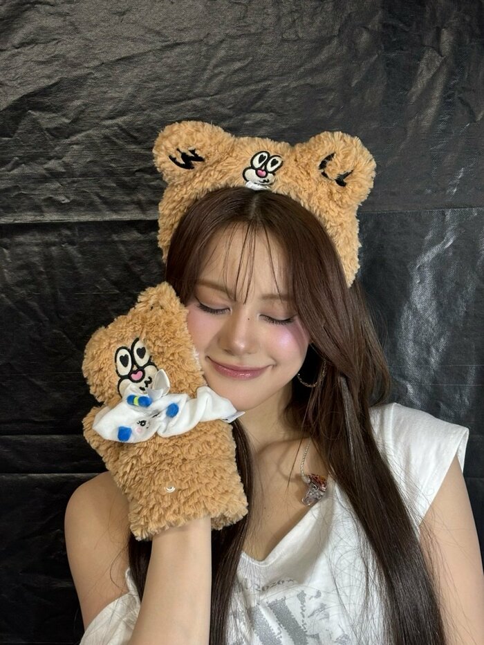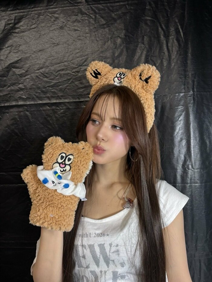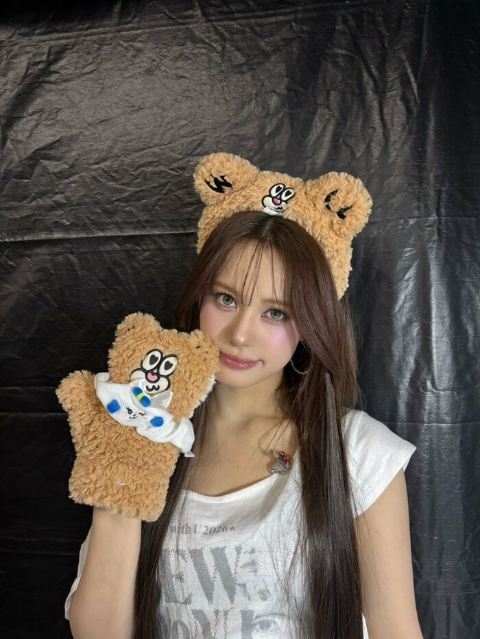 そこには、白のTシャツ姿のNINAさんが、WithU(NiziUファンの総称)を象徴としたキャラクター「Weni」(ウェニー)のカチューシャとグローブを身につけています。もこもことした毛皮がなんともキュートで、NINAさんの魅力がマシマシに!