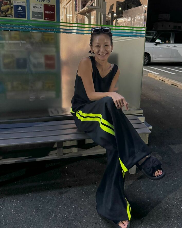 公開されたショットでは、コンビニの外にあるベンチに座り、満面の笑顔を見せる西山さんの姿が!ファッションは黒のタンクトップに、ネオンカラーのラインが入ったジャージのラフな格好。髪はお団子にまとめ、サングラスを頭にかけていました。