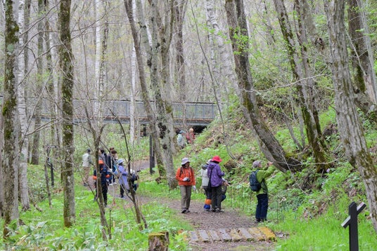 森の情報館から徒歩10分ほどのところにある「シラネアオイの小径」では毎年500本以上の花が見られ、エリア全体で1,500本ほどの花を見ることができます。