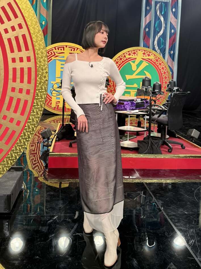 そして、デコルテと肩を大胆に見せたニットに、美脚がうっすらのぞいたシアーのロングスカートを合わせた衣装姿のショットも披露。岡田さんは、腰に軽く手を添えたポーズでクールに視線をはずしていて、洗練された雰囲気が漂っています。