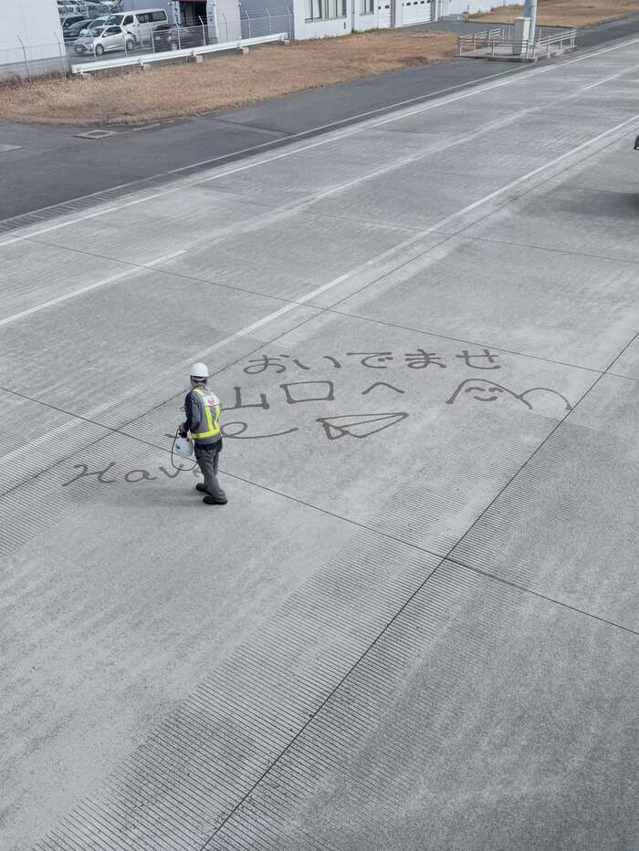 公開された写真には、空港の整備士が「おいでませ 山口へ」と、にっこり笑顔のイラスト付きで地面にメッセージを書いている様子が収められていて、心がほっこり癒されます。