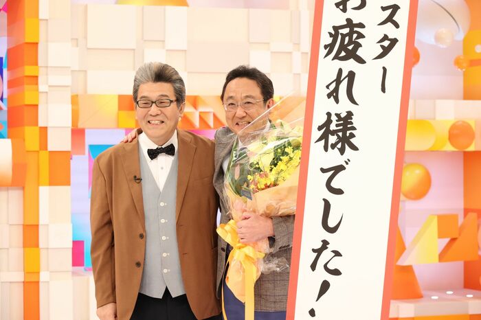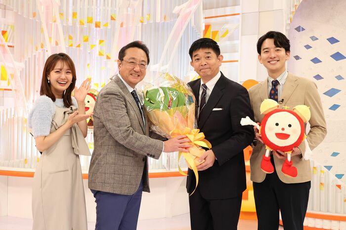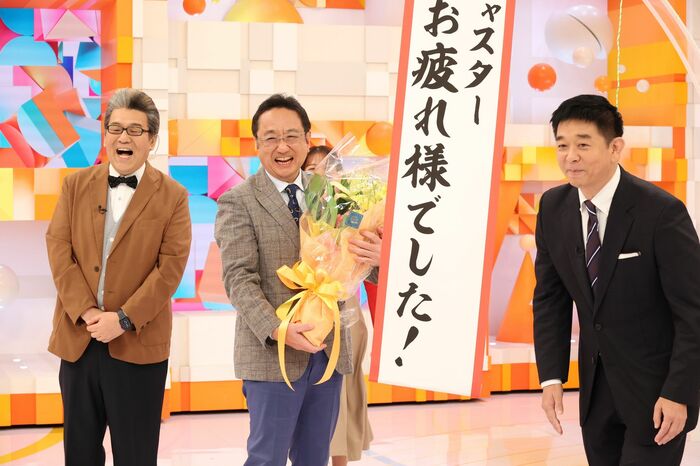 番組終了間際で「三宅正治アナウンサー、おつかれさまでした!」のくす玉が割られ、9月30日(月)からメインキャスターをつとめる伊藤アナから花束を受け取ると、12年半の重責を果たした三宅アナは、ほっとした表情に。