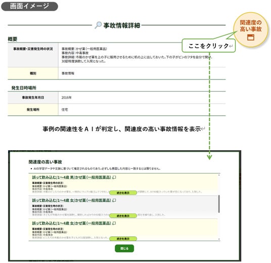 閲覧中の事故情報について、事故種別や対象となる子供の年齢等の情報を基に、関連性の高い情報をAIが判定し表示する機能を追加しました。