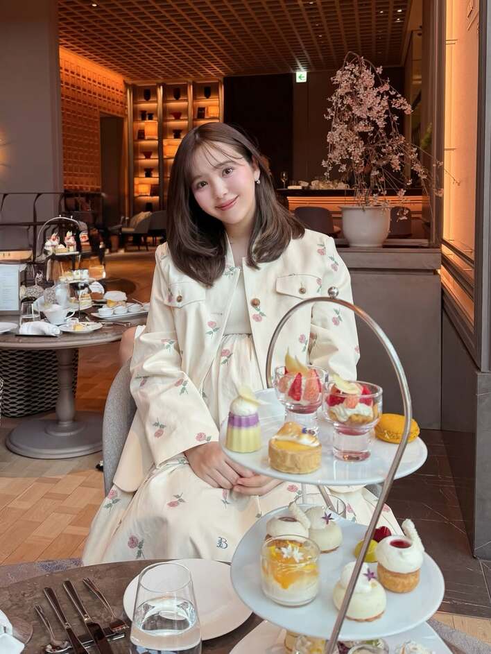 そして、フルーツたっぷりのミニパフェやミニケーキなど、さまざまなスイーツが並んだ3段のケーキスタンドの前で、首をかしげて優しくにっこりほほ笑んだショットも。藤田さんからは穏やかで満ち足りた空気感が漂い、幸せオーラがあふれ出ています。