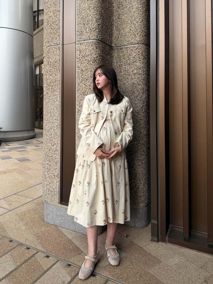 今回の投稿では「アフタヌーンティーの日」とつづり、ふんわりとしたシルエットの小花柄のワンピースに同柄のジャケットを羽織ったマタニティコーデを披露した藤田さん。藤田さんは、前にせり出すように大きくなったおなかを優しく包み込むように両手を重ね、遠くを見つめています。