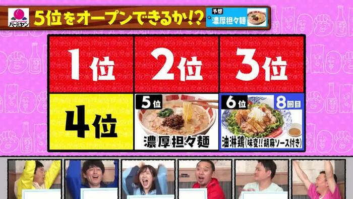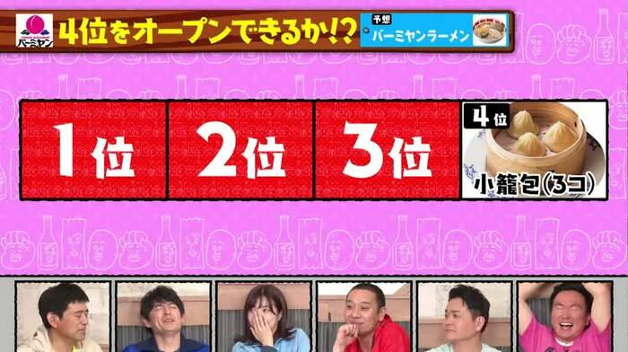 最後の1品を当てる個人予想では、「小籠包(3コ)」と予想したのが3人、「バーミヤンラーメン」と予想したのが3人で意見がまっぷたつ!