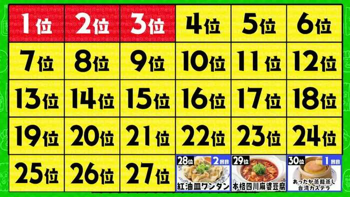 8位「台湾大からあげチャーハン」、7位「五目焼きそば」、6位「油淋鶏(味変!!胡麻ソース付き)」、5位「濃厚担々麺」と、着実に1つずつオープン!