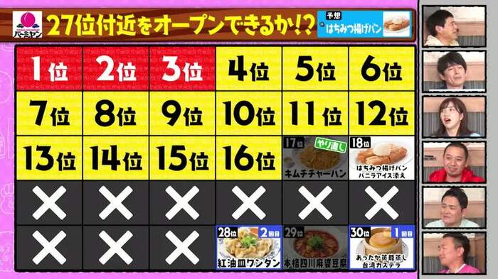 しかし、続けて指名した「キムチチャーハン」が17位。やり直し権を利用して選んだ「はちみつ揚げパン バニラアイス添え」が18位と、一転して大ピンチに。