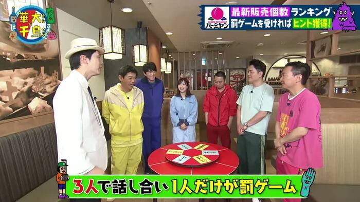 罰ゲームを受ければヒントを獲得できるというもの。3枚の罰ゲームカードが貼られた中華テーブルのルーレットを回して、目の前に止まった3人のうち1人が罰ゲームを受けることに。