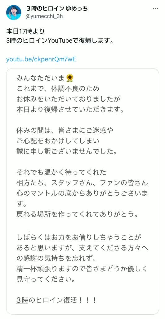 3時のヒロインのゆめっちさんが、復帰することを発表しました。