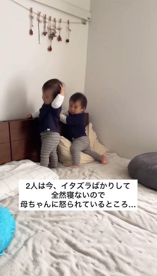 この日、夕方近くまで予定があり、お昼寝の時間を逃した2人を、帰宅後お母さんは急いでベッドに連れて行きます。
